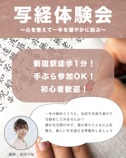 写経体験会【2025年12月13日(土)14:00〜@新宿】にご参加希望の方は、下記にご記入の上、送信ボタンより送信をお願いします。定員に達し次第、募集を終了させていただきます。